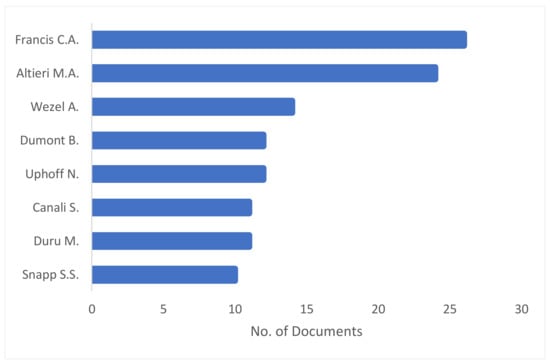 A list of the top authors with at least 8 documents to their name in the search results is presented in Figure 5. The list is topped by Prof. Charles A. Francis and Prof. Miguel A. Altieri. Prof. Altieri is the author of the books ‘Agroecology: The Science of Sustainable Agriculture’ (1987) and ‘Agroecology and the Search for a Truly Sustainable Agriculture’ (2005). A significant name in the list is Prof. Norman Uphoff, who is credited with much of work behind the success of the System of Rice Intensification (SRI) all over the world. The analysis takes into account all authors and affiliations not just the principal/corresponding authors.
