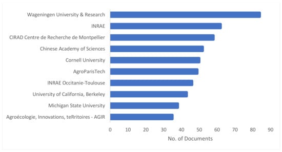 A list of the top 10 research entities worldwide based on the number of publications in the research field under consideration is presented in Figure 6. A clear frontrunner in this field is Wageningen University and Research from Netherlands with the other two top spots occupied by two other European research entities. This makes for an interesting reading. While as the US leads the country wise distribution of research output in this field, the institute wise distribution is dominated by non-US research entities. However, as with the author’s list, in the institute list as well, the name associated with SRI, Cornell University occupies the fifth place. This can again be attributed to the widespread research being done in the agroecological methodology of rice cultivation, the System of Rice Intensification. Cornell University is home to the SRI International Network and Resources Center (SRI-RICE).