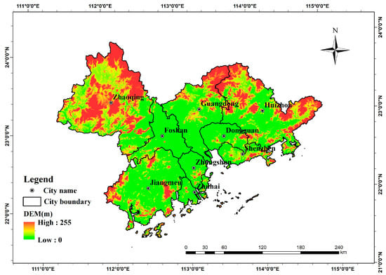 The urban agglomeration in the Pearl River Delta is situated in the southeast of Guangdong province, in the lower reaches of the Pearl River, adjacent to Hong Kong and Macao (Figure 1). Guangzhou and Shenzhen are the core cities of the region, with other major cities including Zhuhai, Foshan, Huizhou, Dongguan, Zhongshan, Jiangmen, and Zhaoqing. The Pearl River Delta is known as the “South Gate of China” because of its geographic advantage of being positioned across the sea from Southeast Asia. The area is below 255 m above sea level, and it has a central plain and is surrounded by hills, mountains, and islands. The region has a subtropical climate in which the rainy season is synchronized with the hot season. The annual average temperature is 21–23 mpe, and the average annual precipitation is over 1500 mm. The typical vegetation is subtropical evergreen broad-leaved forest. The region is characterized by a multichannel water network and various different wetland types. The estuary delta extends to the South China Sea.