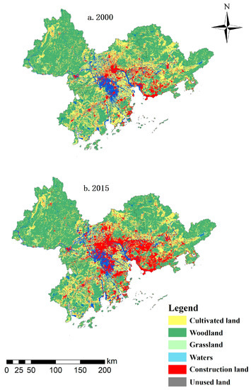 Table 2 showed that in 2000, the order of land-use types in the Pearl River Delta was ranked according to the size of the area, which is consistent with the findings of 2015 (forest > cultivated land > construction land > water area > grassland > unused land). However, there was a clear expansion of construction land over the study period with an associated loss of cultivated land and forest.