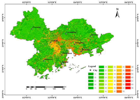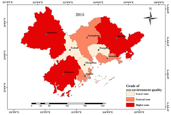 The eco-environment index of the Pearl River Delta region was clustered by using the Euclidean distance method in SPSS v.20 software (Table 7). According to the clustering results, nine administrative units in the study area were divided into five ecological quality grades (Figure 7 and Figure 8).