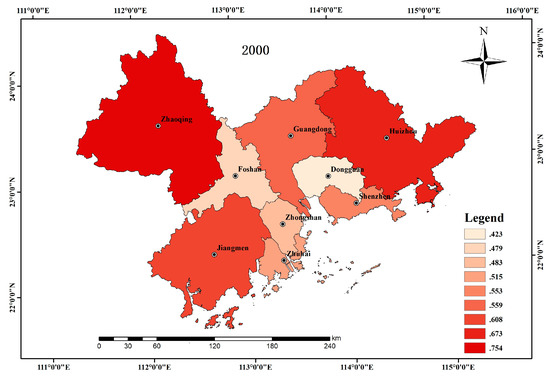 Overall, the ecological environment quality of all cities in the Pearl River Delta was higher than the low-value category; in 2000, the ecological environment quality was worst in Dongguan, and by 2015, the ecological quality of Foshan and Zhongshan had also been reduced from the moderate level to the same level as Dongguan, which is divided into lower levels. The quality of the ecological environment in most cities was at the moderate level and above. In 2000, the ecological index of Zhaoqing was higher than 0.75, and the quality of ecological environment was classified as high level. A specific analysis of these findings is presented below:
