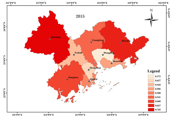 The regional eco-environmental quality index of the Pearl River Delta in 2000 and 2015 was calculated according to Formula (2). The results were 0.63 and 0.61, respectively, indicating that the regional eco-environmental quality index of the Pearl River Delta urban agglomeration decreased over the study period, with an average annual decrease of 0.11%. This shows that the ecological environmental quality of the Pearl River Delta region deteriorated between 2000 and 2015, which maintains the dynamic stability of the regional ecological environment overall.