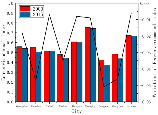 According to Formula (2), it was found that land-use changes in the Pearl River Delta region between 2000 and 2015 led to various levels of change in the ecological environment quality of cities (Figure 4 and Figure 5). Based on the spatial scale, Zhaoqing, Huizhou, and Jiangmen moderately had the higher eco-environment index values, which are scattered around the Pearl River Delta region. In contrast, Dongguan, Foshan, and Zhongshan which were concentrated in the central region of the Pearl River Delta, and they had the lowest eco-environment index. Guangzhou, as the capital of Guangdong province, had relatively good ecological quality, ranking fourth. Therefore, the ecological environment of the Pearl River Delta region was characterized by poor environmental quality of the central cities and good environmental quality of the surrounding cities. The eco-environmental index of cities in the Pearl River Delta region moderately decreased between 2000 and 2015. That of Dongguan, Shenzhen, and Zhongshan deteriorated considerably, with the eco-environmental index decreasing by 0.051, 0.047, and 0.046, respectively. Huizhou, Zhuhai, and Jiangmen showed much less deterioration, with decreases to the eco-environment index of 0.007, 0.007, and 0.008, respectively.