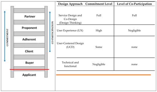 As can be seen in the right-hand part of Figure 1, the technical-functional approach uses the customer’s commitment only to a negligible extent. On the other hand, the UCD approach makes greater use of customer involvement, but does not use customer co-participation, unlike the subsequent UX approach, which already makes almost full use of customer involvement and makes partial use of customer co-participation. The design approach, service design, makes full use of customer engagement and, to a large extent, customer co-participation. The co-design approach, on the other hand, makes full use of the customer’s commitment and co-participation for the design and improvement of services—mainly modern services.