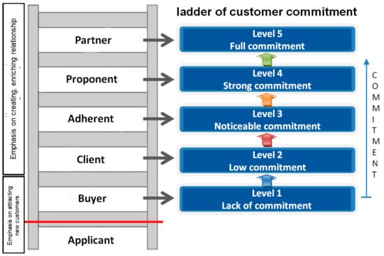 Customer commitment is key to building brand loyalty and lies at the conceptual core of the solution proposed in this paper. In English language literature, one finds much discussion of ‘customer involvement’, with this term indicating one of two phenomena: (1) ‘commitment’, meaning an attitude related to the willingness to take specific actions (a pragmatic aspect of involvement) [31] and (2) ‘engagement’, meaning an attitude of interest in e.g., matters of a favorite brand (positive emotional involvement, but not necessarily implying the willingness to take action). In the context of this article, customer involvement is understood in terms of commitment [32]. To build customer loyalty and commitment, elements derived from psychological science are frequently used, but beyond them, there are also relationship aspects that are described by relationship marketing (also called partner marketing) [6,33]. Maintaining and acquiring customer loyalty is a long-term process which requires systematic efforts from the service company and its employees. The type and scale of actions taken depends on the current level of customer relations [34].