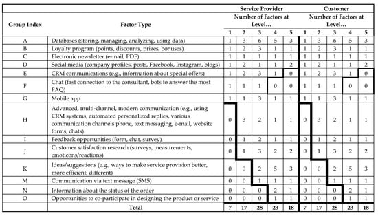 Table 2 shows the distinguishing features of a modern service, broken down into those that are essential (and often also available in traditional services) and those that are optional. The essential (necessary) features must appear during or after the provision of the service; otherwise, we are dealing with a traditional service [23]. The optional features of a modern service do not have to appear in order to conclude that the service is modern.