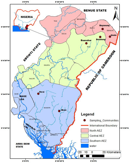 The data for the study were gathered between March and September 2019 using structured interviews and in depth content analysis. Before the administration of the questionnaire, one community liaison was picked from each of the sampled communities and trained on the process of data collection in the field. The questionnaire was personally administered to forest-dependent communities in Cross River States using a multistage sampling frame [45]. The sampling plan involved the stratification of the study area into the three agroecological zones [46]; SAZ, CAZ and NAZ. The second stage was the purposive selection of two forest-dependent communities per agroecological zone. The communities were selected either because there are REDD+ communities or they share boundary with REDD+ communities. Finally, random selections of household for the administration of the instruments of data collection was carried out [45,47].