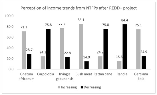From the study, income status of the respondents after the advent of REDD+ projects showed increases except incomes from Carpolobia spp., Randia and Rattan cane which showed decreases in income trends. The overall increase in income from NTFPs in the study area (for four out of seven NTFPs) could be attributed to the moratorium on logging put in place in the early stage of REDD+ by the state government since 2008 [73]. This according to Langat [74] can be attributed to the fact that the elites in the forest-dependent communities extract capital intensive forest products like logging of trees, establish large scale cocoa, banana, plantain farms, among others, and have access to markets. Income from these sources is used to support the regular income stream (emoluments from salaries). Lower-income members of the community do not have capital intensive and large-scale agricultural enterprises neither do they have a steady source of income outside the natural capital. Additionally, most importantly they do not also have access to capital intensive markets as they are content with subsistence-related livelihoods [72].