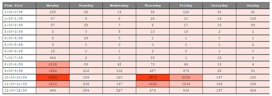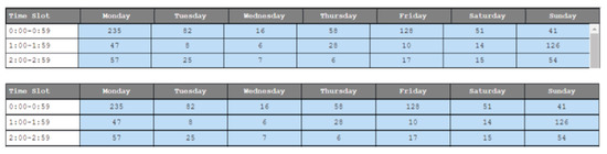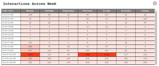 JSMLA’s analysis table, where the different interactions across the evaluated period of time are distributed across the week hourly.