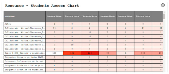The next widget is a table that represents the number of times a member of the course has interacted with each course resource (see Figure 11). It can be used to analyze more specific data about each student and its relationship with the course elements, showing the number of times every student has interacted with every course element.
