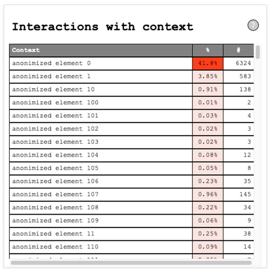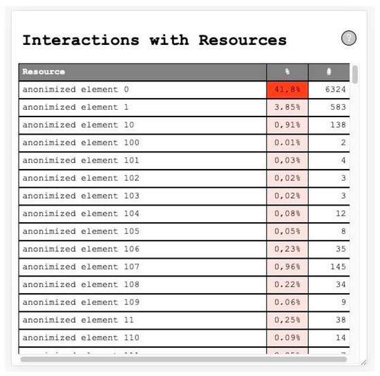 In case there is a reduced number of rows, as it happens with widgets like interaction with components, events, or URLs, their representation is translated to pie plots, as they provide a small group of elements. It is also applied to students’ participation and interactions with context, as these plots provide a similar structure to identify the largest groups and allows the end-users to identify said group through a hover. If there is a large number of rows and/or students, a scatter plot is provided, as it provides an axis for each student, it is possible to represent the number of times each element has been interacted with and can be easily filtered. When it comes to representing the last access for each user, the format has changed to provide an unbiased plot that represents data without any interpolation. New widgets are developed, such as students’ time dedication to the course and detailed resources. Such changes are openly available in the GitHub repository [28].