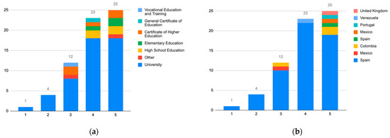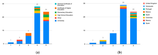 (a) Distribution of perceived usefulness by teachers across educational stages on resource interactions. (b) Distribution of perceived usefulness by teachers across countries on resource interactions.