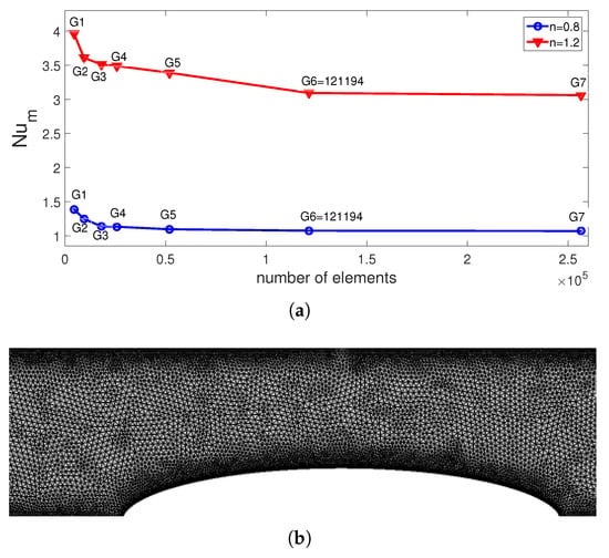 Mesh independence tests are performed to find the optimal mesh configuration. Test results with coarse grid (G1, 4551 number of elements) to extra fine grid (G7, 256,324 number of elements) are shown in Figure 2a at two power law indices. G6 (finer grid, 121,194 number of elements) is selected for the subsequent computations. Grid refinements were made near the walls and curved parts. Its distribution in the vicinity of the curved parts is given in Figure 2b.