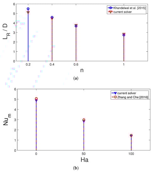 Impacts of using non-Newtonian power law fluids on the flow separation is considered for shear thinning fluid as in Ref. [56] for power law indices between 0.2 and 1. A correlation in the exponential form is proposed which depends upon the Re number and power law index. Comparison results of reattachment length with different power law indices at Re = 100 are given in Figure 3a,b. The highest difference of 5% is obtained with . Validation study was also performed for case with MF effects. Convective HT with MF effects was considered and impacts of MF strength on average Nu comparisons are given in Figure 3b for fixed value of Grashof number at . The highest deviation is found to be below 5% between the results of [57].