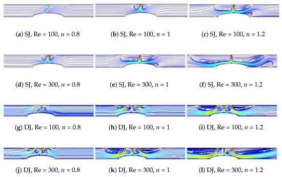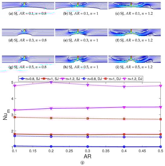 The partly curved wall size impacts on FPs for SJ case and average Nu variations for SJ and DJ cases are shown in Figure 12a–i and in Figure 12j. The curvature is an ellipse while the effects are characterized by aspect ratio (AR) which denotes the ratio of the radius in the minor and major axis. For the fixed value of minor axis radius, increasing the AR reduces the size of the ellipse in the wall jet direction. The fluid impinges on the curved surface and a separated flow region is established in the wall jet region over the curved surface for shear thickening fluid at = 0.1 while it occurs away from the curve surface near the flat bottom wall for = 0.5. For shear thinning fluid, recirculations on the partly curved wall are not appeared for all values of . The recirculation near the inlet are affected by varying the values especially for power law index of n = 1.2 which is due to the occurrence of the secondary recirculation zones. Average Nu variation is 5.8% for n = 1.2 with SJ configuration and it is 5.43% for n = 0.8 with DJ case when lowest and highest values are considered.