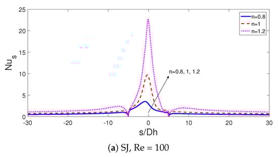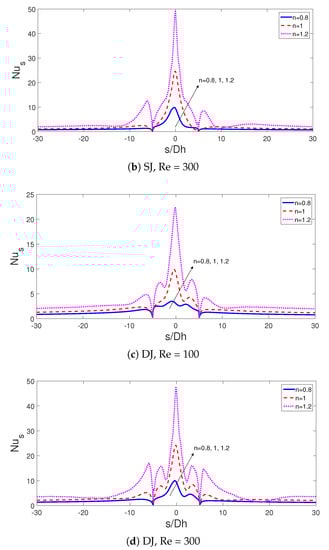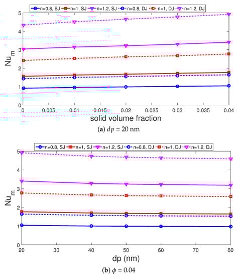 Adding nano-sized particles and varying its size changed the convective heat transfer features for fluids with different power law indices as shown in Figure 13a,b. The increment amount with depends upon the jet configuration and fluid type. Configurations with DJ and shear thinning fluid (n = 0.8) resulted in the highest HT increment which is 14.7% as compared to pure water at the same power law index while this value is 14.10% for SJ configuration. However, for shear thickening fluid, the potentiality of using NFs in HT enhancement becomes lower which is 12% for SJ and 13.4% for DJ cases. It is advantageous to use NFs in DJ configurations but the difference in HT enhancement with NF is below 2% when compared to SJ case at the same . Higher nanoparticle size resulted in lower values of average Nu and the amount of decrement is between 6% and 7% for SJ and DJ configurations with various power law indices.