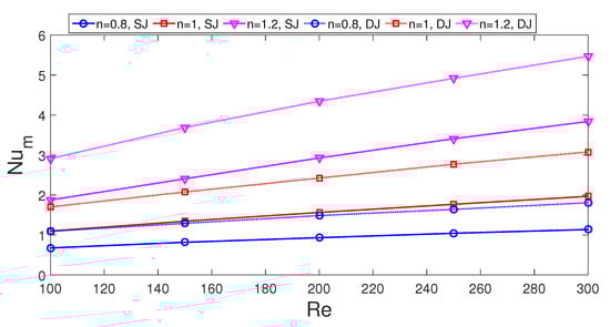 Average Nu number versus Re number variations of SJ and DJ configurations for different power law indices ( nm).