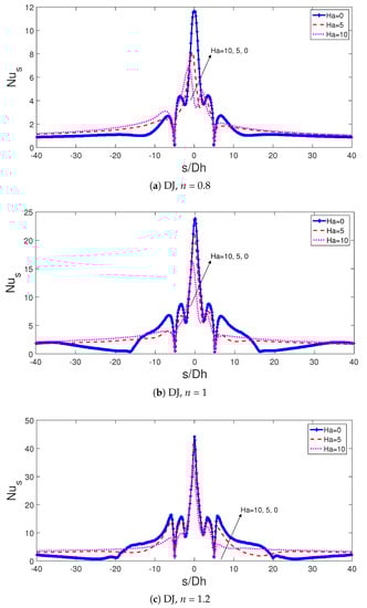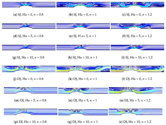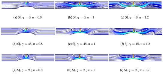 When shear thickening fluid (n = 1.2) is considered, the highest Nu is obtained at for SJ case while it is minimum for DJ case. For SJ configuration, there is 7.3%, 11.8% and 1.5% variations in the average Nu number with fluids at power law index of n = 0.8, n = 1 and n = 1.2 when horizontal and vertical alignment of MF are compared while these values become 24.6%, 20.7% and 0.5% for DJ configuration (Figure 11).