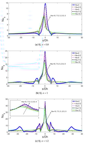 Local Nu number variations for different MF strengths for shear thinning (a), Newtonian (b) and shear thickening (c) fluid at SJ configuration (Re = 250, = 45, = 0.25, = 0.04, = 20 nm).