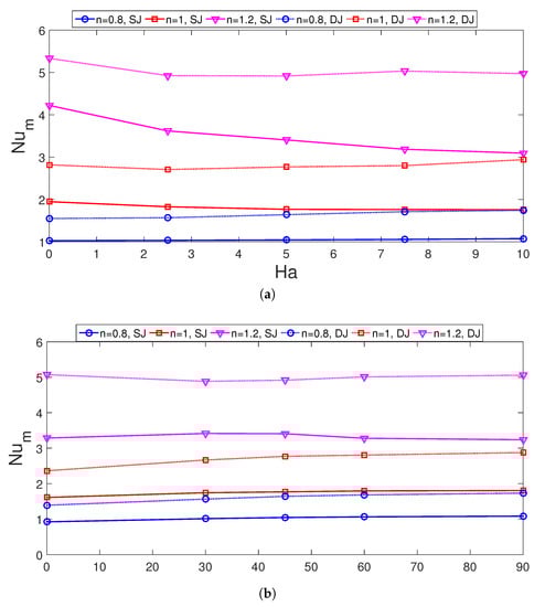 Impacts of MF strength (a) and inclination (b) on the average Nu number variations for different power law fluids at SJ and DJ configurations ( nm).
