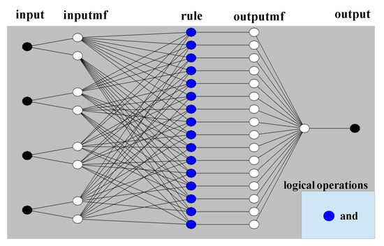 Different layers are available in the ANFIS modeling [61]. Input variable is blurred with the membership functions in the fuzification layer while the membership grade for the input variable is formed. In the second layer, fixed nodes and the product is the firing strength of the rule as denoted by: