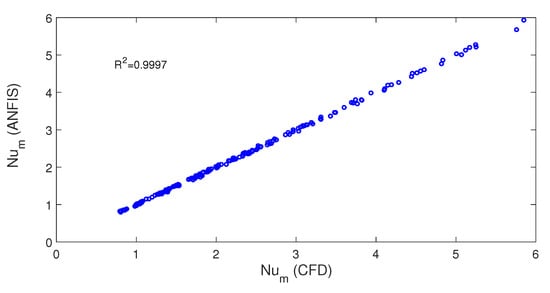 Comparisons of average Nu number predicted with ANFIS and obtained with computational fluid dynamics simulations.