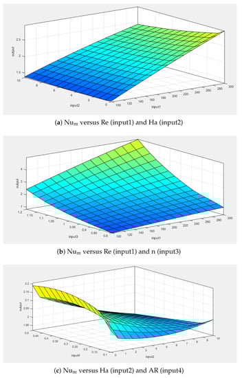 Surface plots generated with ANFIS for variation of average Nu number for different input parameters.