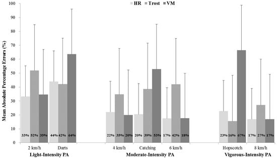 Mean Absolute Percentage Errors for energy expenditure (EE) estimated by heart rate (HR), Trost equation, and vector magnitudes (VM).