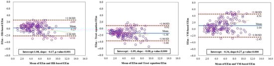 where, gender is 0 for boy and 1 for girl and VM is calculated by counts per minute. The heart-rate-based equation is F = 213.286 (p < 0.001) and the explanatory power is 81.8% (adj R2 = 0.814, SEE = 1.171, Durbin-Watson = 1.886); the VM-based equation is F = 196.805 (p < 0.001) and the explanatory power is 80.6% (adj R2 = 0.802, SEE = 1.210, Durbin-Watson = 1.902). The Trost et al. []-based equation (EEm = −2.23 + (0.0008 × VT, counts per minute) + (0.08 × weight)) was applied to compare the EE estimates between three EE predictive equations.