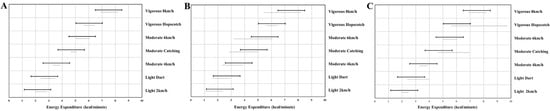 - Harrell, J.S.; McMurray, R.G.; Baggett, C.D.; Pennell, M.L.; Pearce, P.F.; Bangdiwala, S.I. Energy costs of physical activities in children and adolescents. Med. Sci. Sports Exerc. 2005, 37, 329–336. [Google Scholar] [CrossRef]