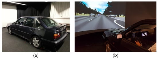 Experiments were conducted between June and August of 2019, in the driving simulator DriS of the Faculty of Engineering at the University of Porto (FEUP). DriS is a full-scale light vehicle fixed-base driving simulator completely developed by the FEUP’s members and partners (Figure 1a), which can be modified and customized according to the objectives of different studies. In this study, the vehicle was used in a manual driving mode to create a more demanding situation. Moreover, the FOVIO® eye-tracking system was installed inside the driving simulator to record eye features. The device was placed behind the steering wheel, without interfering with the drivers’ view.
