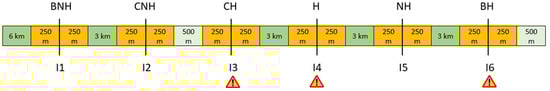 The scheme of the driving session is shown in Figure 2. The sections represented in green are segments formed by curves and straight segments, while the segments around the intersections (in yellow) do not have curves. As can be seen, the first time each non-driving related task is performed, there is no critical event to ensure that, in the second time, with an unexpected event, the distractive task is performed as naturally as possible. The order of the events was chosen to minimize learning effects. Moreover, the type of the approaching vehicles, the road environment, and the traffic flow changed across the events.