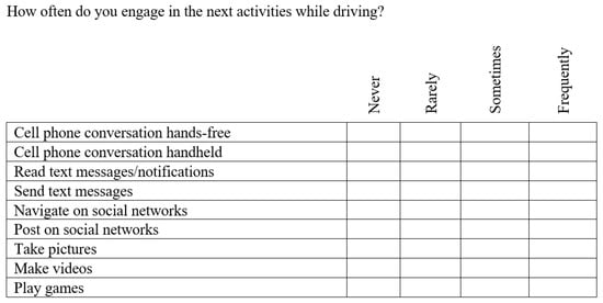 Before the driving experiment, each participant was asked to fill a questionnaire about generic personal information and driving habits. This questionnaire obtained information about age, gender, body mass index (BMI), and hours of sleep on the night before the experiment. Furthermore, participants were asked to rate (in four levels, from “never” to “frequently”) how often they usually engage in the listed secondary tasks while driving. The rating card shown to the participants is depicted in Figure 3.