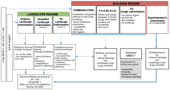 Authorization procedure for solar systems in Italy, referring to the two legislative regimes: building and landscape. The requirement criteria for rooftop solar systems extrapolated from the provisions and recommendations identified by MIBACT are also reported in the figure.