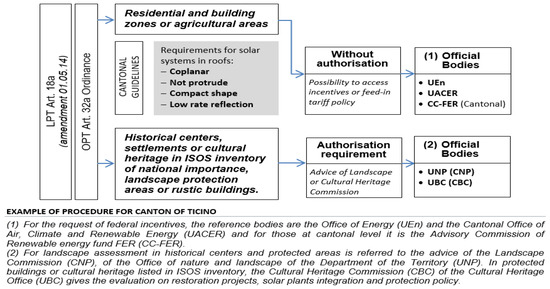 Landscape assessment in historical centers and protected areas is referred to the advice of the Landscape Commission (CNP) of the Office of nature and landscape of the Department of the Territory (UNP). In protected buildings or cultural heritage listed in the Federal Inventory of Heritage Sites (ISOS), the Cultural Heritage Commission of the Cultural Heritage Office (UBC) gives the evaluation of restoration projects, solar plant integration and protection policy. A simple notification (art. 22 of the LPT [44]) is enough for installations in building zones designated by the cantonal law where the aesthetic aspect is less important, and it is the same in agricultural zones. Furthermore, article 32a of the Ordinance OPT [45] identifies the binding criteria for solar systems. It establishes a 20 cm limit on the allowed orthogonal projection with respect to the roof surface, while it does not allow any projection of the solar system in the frontal part of the elevation (main facade). It is therefore identified that some caution must be exercised regarding the maintenance of the lines of the building and the desire to preserve the original geometry of the architectural artifact, as well as the need to return a compact view of the surface involved. The ordinance considers appropriate a low reflection rate of the integrated panels, without providing specific reference percentages, but it is limited to considering the state of the art. Figure 3 summarizes the authorization procedure for solar systems in Switzerland (e.g., Ticino Canton).
