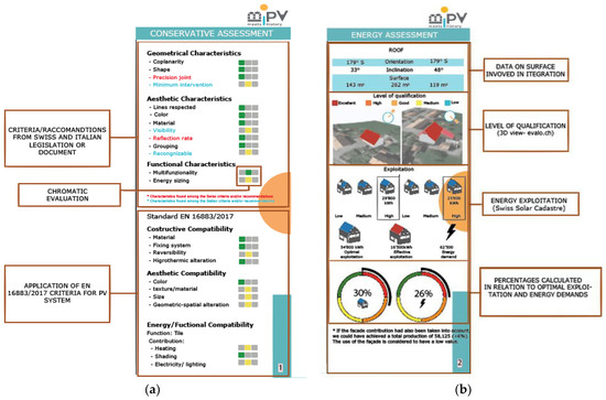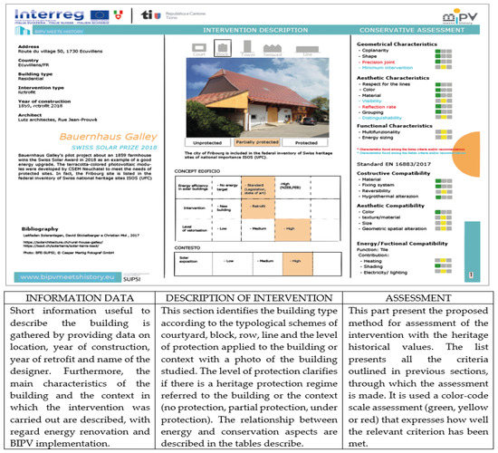 Assessment of case studies and solar BIPV solutions in technical schedules: (a) Building sheet, BIPV heritage compatibility; (b) Technical sheet: BIPV functionality and energy benefits.