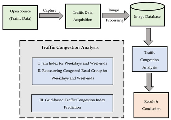 In this section, we first describe our approach to data acquisition, preprocessing, and database design from raw snapshots of the online traffic congestion map. Then, we propose city-wide (i) congestion pattern analysis based on image processing and (ii) grid-based congestion index prediction. Figure 1 shows the complete methodology for traffic congestion analysis.