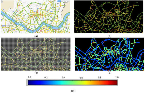 Image Data Preprocessing. (a) A snapshot of traffic congestion data from TOPIS website. (b) A sample of the Image dataset after road network extraction based on Algorithm 1, where the black color represents the background. (c) The road network segmented into 200 × 200 m2 grids. (d) The congestion index of each grid. (e) Congestion Index distribution color scale.