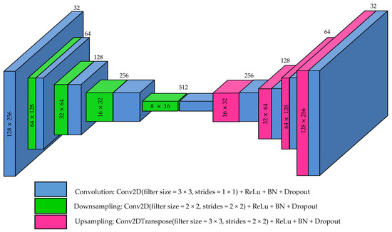 In this section, we explain the details of the CIPNet model architecture. As shown in Figure 3, the proposed model has 17 layers, nine convolutional layers, four downsampling layers, and four upsampling layers. The input to the model is a sequence of 12 historical images with the dimension of 128 × 256 and a channel depth of 1. The output of the trained model is a predicted image with a time horizon of (10, 20, 30, 45, and 60) minutes and have same image dimension as the input image. The sequence of input images is fed to a 2D convolutional layer which has 32 filters of size 3 × 3, a stride of 1 × 1 with zero paddings, a kernel weight initialization based on ‘he uniform’ and ‘ReLU’ as activation function. This layer convolves the input image without reducing the spatial dimension of the inputs. The convolutional layer is followed by a downsampling layer performed by a 2D convolutional layer consisting of 64 filters of size 2 × 2 and the stride of 2 × 2 without zero padding. The convolution layer and the downsampling layer are stacked one after another. The convolutional layer extracts the feature without decreasing the spatial size. The downsampling layer, on the other hand, halves the spatial size in both directions while doubling the number of filters compared to previous layer. The input dimension of 12 × 128 × 256 × 1 is encoded into 12 × 8 × 16 × 1 by the convolutional encoder. The combination of upsampling layers and convolutional layer regenerates the latent image representation to its original dimension. The upsampling layer doubles the spatial dimension while reducing the filter size to its half, formed by a Convolutional 2D Transpose layer with a filter size of 2 × 2 and strides of 2 × 2 without zero padding. All layers have a dropout of 0.1 and batch normalization layers.