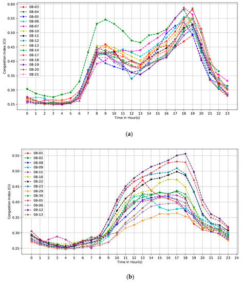 Figure 4a is the graph of the congestion index distribution for weekdays and shows similar trends for all working days. The congestion index increases rapidly from (25–30%) at 06:00 to about (40–45%) at 09:00 and remains in the same range until 15:00, then further increases to (50–60%) between 18:00 and 20:00, and gradually decreases thereafter. On weekdays, the morning peak hour begins at 08:00, where congestion is relatively low compared to the evening peak hour, which occurs between 17:00 and 21:00. Based on the congestion index boundary condition from Table 1, the city of Seoul experiences a free congestion condition in the early morning until 07:00 and between 23:00 and 24:00, while it approaching a city-wide congestion condition between 18:00 and 19:00 and has sloe congestion condition during the rest of the period. Similarly, Figure 4b shows the distribution of the jam index for weekends. The congestion index value does not follow similar trends as in the weekday analysis. Nevertheless, there is a sharp increase in the congestion index from (20–35%) in the morning until 09:00 to (35–55%) between 09:00 and 21:00 with the maximum between 15:00 and 19:00. From Table 1, it is observed that the city experiences congestion free condition in the early morning till 09:00 and late evening between 21:00 and 24:00, and slow congestion condition during the rest of the day. The analysis of congestion index distribution on weekdays and weekends shows that road traffic in Seoul city does not operate at optimal capacity, and large congestion occurs during peak hours. Consequently, a study of reoccurring traffic patterns and congestion predictions is needed to evaluate and solve the city-wide congestion problem.