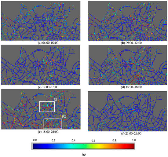 Weekdays Stochastic Congestion Maps 06:00–24:00. The likelihood of reoccurring congestion in the road network, in Figure (a–f). The likelihood color scale for the occurrence of traffic congestion, in Figure (g).
