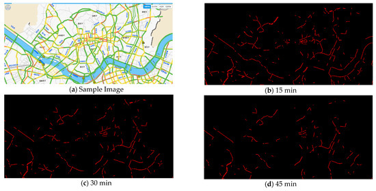 In this subsection, we construct the reoccurring traffic congestion pattern based on Algorithm 3 presented in Section 3.2. Figure 5 shows the reoccurring traffic congestion pattern under different conditions. Figure 6a is an example of a raw image extracted from the website showing the spatial structure of the road. Figure 6b–d shows the reoccurring congestion patter of the city based on the road network affected by congestion for at least 15, 30, and 45 min in an hour in a day and repeating the same pattern for at least half of the observation day. The frequently reoccurring congested roads are shown in ‘red’ color, and all other non-congested roads with background are shown in black color. In Figure 6b, the number of the reoccurring roads is immense and can be seen in almost every part of the city. Thus, the 15 min congestion statistic is not an optimal criterion for designing the reoccurring congestion pattern. Instead, 30 and 45 min congestion patterns give the road network with high priority. Therefore, to alleviate the city-wide congestion problems in the road network, the traffic management authority can use the congestion pattern from Figure 6c,d to investigate and solve the congestion cause on each road. Solving the congestion problem of congestion-prone roads can significantly reduce congestion in the city.