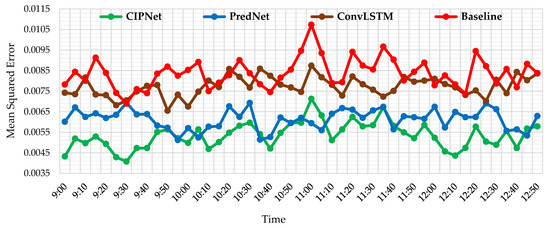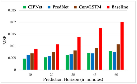 Figure 7 shows the detailed MSE result of all the prediction models for prediction horizons of 10 min on 12 October 2020, in a period from 09:00 to 12:50. The proposed network, CIPNet, has the lowest mean squared error compared to PredNet, ConvLSTM and Baseline. The proposed model achieves significantly lower MSE than Baseline and ConvLSTM and slightly better than PredNet. Out of 48 instances, CIPNet achieves lower prediction error 41 times, PredNet achieves lower prediction error five times and for the other two times, both CIPNet and PredNet perform equally well. Table 3 shows the hourly average MSE and MAE values for all prediction models and baseline performance for 10 and 60 min prediction horizons on 12, 13, and 14 November 2020 from 09:00 to 13:00. The result shows that the proposed model has the lowest average MSE and MAE error on all three days compared to all other models. The PredNet is close to the performance of the CIPNet for the 10 min horizon. However, for the 60 min prediction, the performance of the proposed model, CIPNet, is similar to PredNet, while the performance of ConvLSTM is poor. Figure 8a,b shows the end–end result of CIPNet for the grid congestion index forecast with the prediction horizon of 10 min on 1 September 2020 at 12:00 and 18:00, respectively. Figure 8 shows that the CIPNet has a forecasting capability for a fine level of granularity and it also shows that it is visually intuitive for policy-makers to plan ahead. Figure 9 shows the average MSE value for all the prediction models on an entire testing dataset for the prediction horizon of 10, 20, 30, 45, and 60 min. The chart shows that the MSE of the proposed model is the lowest for the prediction horizon up to 30 min after which the performance is either lower or similar to PredNet. The plot also shows that all the three prediction models are adaptive as their MSE loss is lower than the baseline performance.