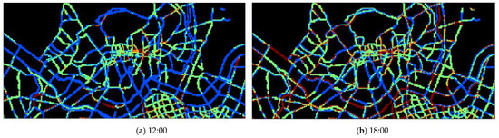 Here,, and are the length, and the factor 0.2, 0.5, and 1.0 are the weights of the free, slow and jam congestion level of the road network. The weight are chosen based on logical considerations, and a similar approach is also discussed in the literature [58]. In general, only roads with jam and slow congestion states are considered in the calculation of the congestion index. Since the slow-congestion state has less impact on traffic mobility than the congested condition when calculating the congestion index, the weight for the slow-congestion state is kept lower than that for the congestion condition. To distinguish congestion-free roads from the background and show the impact of congestion-free roads on the entire network. In addition to congested and slow roads, we also considered congestion-free roads in the calculation of the network congestion index.