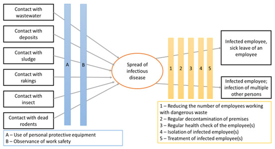 The risk is activated mainly by non-compliance with work procedures and failure to use personal protective equipment, although normative legal standards require their use and the employer must provide employees with them. Failure to comply with these measures results from negligence due to human error. Other possibilities for reducing health risks deal already with the WWTP design phase of the construction or reconstruction by including safety elements protecting employees, choosing proper technology or automating production.