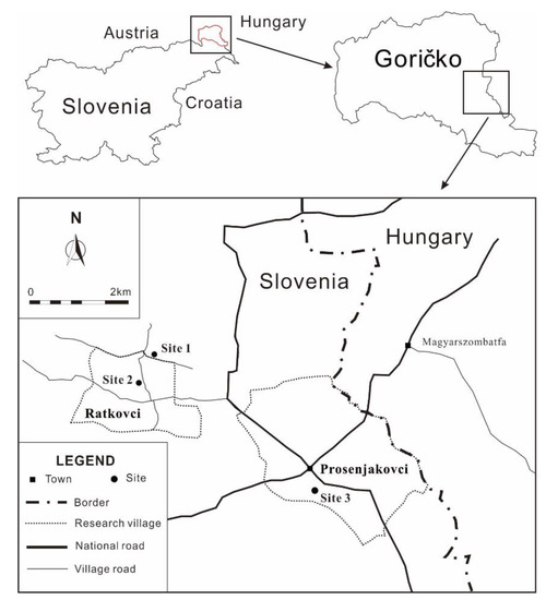 Within the study area, three sites representing abandoned buildings in the area were selected by the director of the Goričko Landscape Park. These study sites are located in two villages, Ratkovci (Sites 1 and 2) and Prosenjakovci (Site 3) (Figure 1), within the Municipality of Moravske Toplice, which borders Hungary and is an area known for its ethnic Hungarian communities. In Ratkovci, the small population of 54 [26] is scattered along the valley of the Ratkovski potok stream and the road linking Prosenjakovci with the Križevci villages. The shallow valley is dominated by meadows with fields on gentle, sunny slopes and forests at higher elevations. The agricultural holdings are small, with honey production and dairying being the main economic activities. Most villagers are employed in the Prosenjakovci village [27]. The roadside village of Prosenjakovci, lying in the valley of the Ratkovski potok stream, is a larger, closely settled, bilingual village located near the Slovenian–Hungarian border at a significant road junction [27], with a current population of 163 [26]. The surrounding area is cultivated, the fields are dominated by wheat and corn, and livestock breeding is highly developed; the southern slopes are planted with vineyards and the northern portion is covered by forest [28].