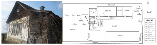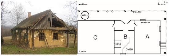 Sites 1 and 2 (Figure 2 and Figure 3, respectively) were representative of numerous abandoned farm dwellings built in the Pannonian style, while Site 3 (the Matzenau Manor) represents a feudal recreational residence of the early 19th century ([29] Figure 4) which, through altered use into a working farm and later being socialised, created an alternative perspective of landscape interaction. Rural buildings in Goričko are oriented in the same direction and they are arranged in a row along one or both sides of the road; however, they do not border it and stand equidistant from it [30]. Visually, there has been a natural continuation from earlier centuries as described by Maučec [31], in whose house description there was usually a courtyard, garden, vegetable garden, well and corn rack. Maučec [31] defined Pannonian houses (Sites 1 and 2) in the Prekmurje region as a result of centuries of development, reflecting historical events, social occasions and anthropogenic endeavour in aspects of material and spiritual culture. The Matzenau Manor (Site 3) was constructed in the first third of the 19th century [32] as a seasonal and hunting lodge set in 150 hectares of park and rural land [29].