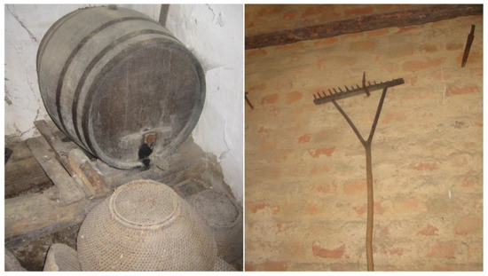 Eighteen baskets constructed from corn stalks and leaves, together with willow baskets and a woven willow cart tray, suggested part-time basket manufacturing, possibly a winter season activity conducted with osier willows and crop residues; several chickens were cooped at elevation, indicating local fox predation; three individual pig pens; two donkey carts; cows; sheep or goats were housed in the lower barn compartment, hay loft and hay rakes; and extensive wine making equipment suggest subsistence farming. However, ploughs, scythes or other metal tools were not observed, nor were oil spots on the floors from mechanical machinery. The homestead was situated on a land area of approximately 0.25 ha, but the tools and artefacts observed suggested that formerly a vineyard, crop land and pastures were utilised (Figure 5). Two wine barrels were recorded in the farmstead. The maize residue baskets, pig pens and trugs for feed mixing suggest cultivated fields, while the hay loft, ladder, hay rakes and donkey carts suggest annual hay making, most probably from adjacent grasslands.