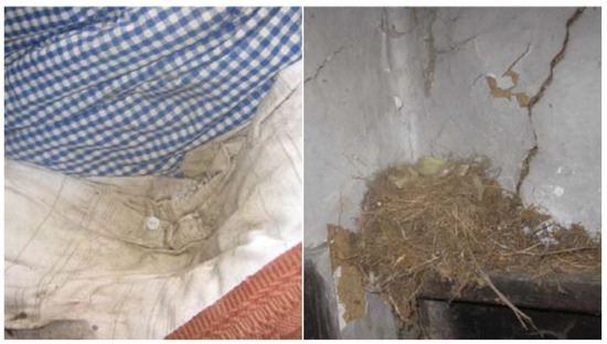 The dominant feature with regard to post-occupation at both Sites 1 and 2 was the significant presence of a beech marten (Martes foina). Beech martens frequently occupy rural areas, using farms opportunistically when they are available but avoiding arable land [37], thus—with the aging of the farmstead buildings—their presence can be assured, particularly in the sparsely populated rural landscape of Goričko. Seed-filled scats were evident and nests had been made in the bedding of the south room and kitchen of Site 1 (Figure 7, Left). Rodent activity was also noted, particularly at Site 2. Mouse traps were recorded in the cellar and rodent holes were observed in the barn rooms at Site 1. Mole (Talpidae sp.) mounds were observed in the orchard area and the mummified remains of two bee species, honey bee and bumble bee, were found on the kitchen window sill. Brightly coloured bird feathers, possibly from the European roller (Coracias garrulus), were also observed on the end of the single bed in the south room of Site 1.